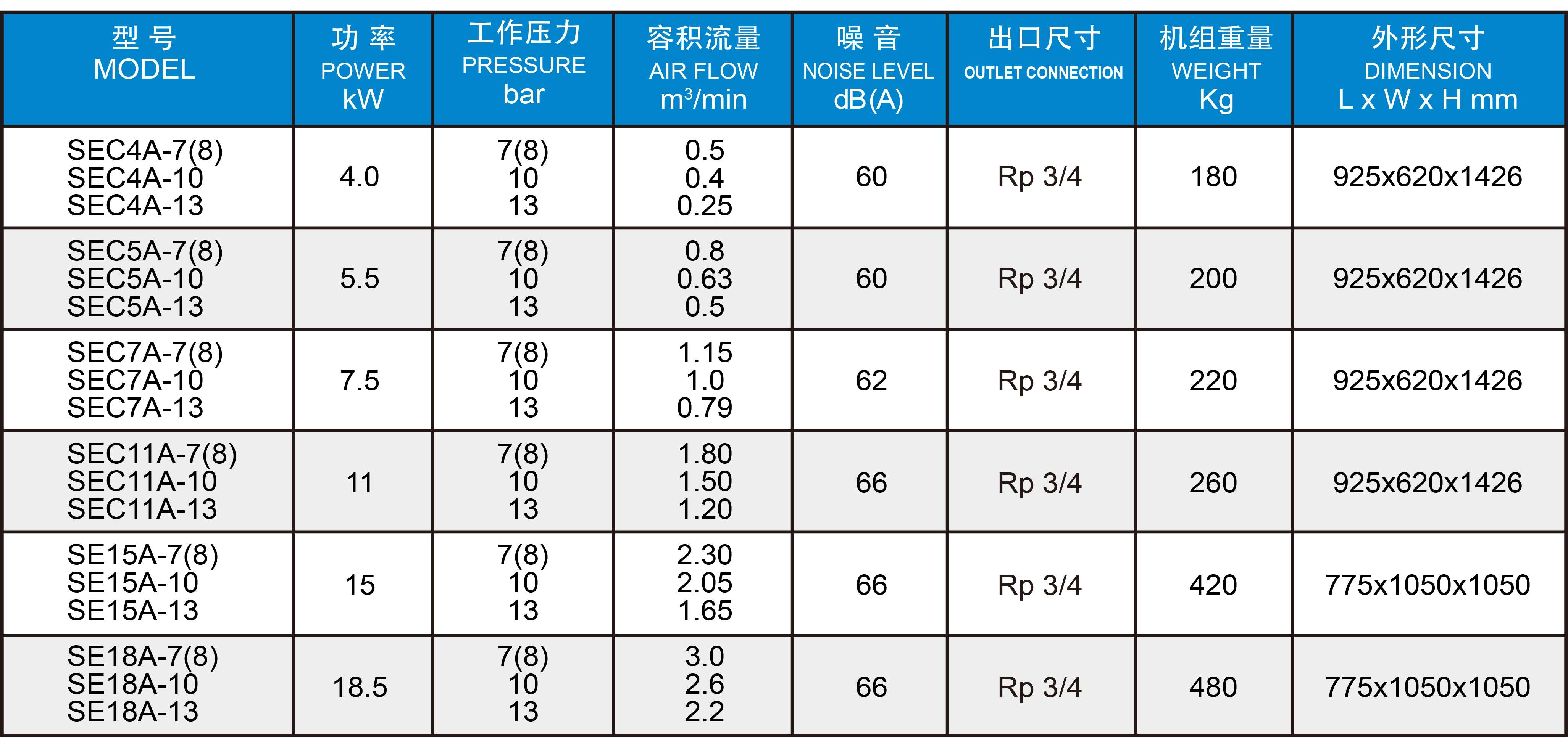 皮带传动SE4-18kW(单级压缩)系列 SPECIFICATIONS OF 4-18kW