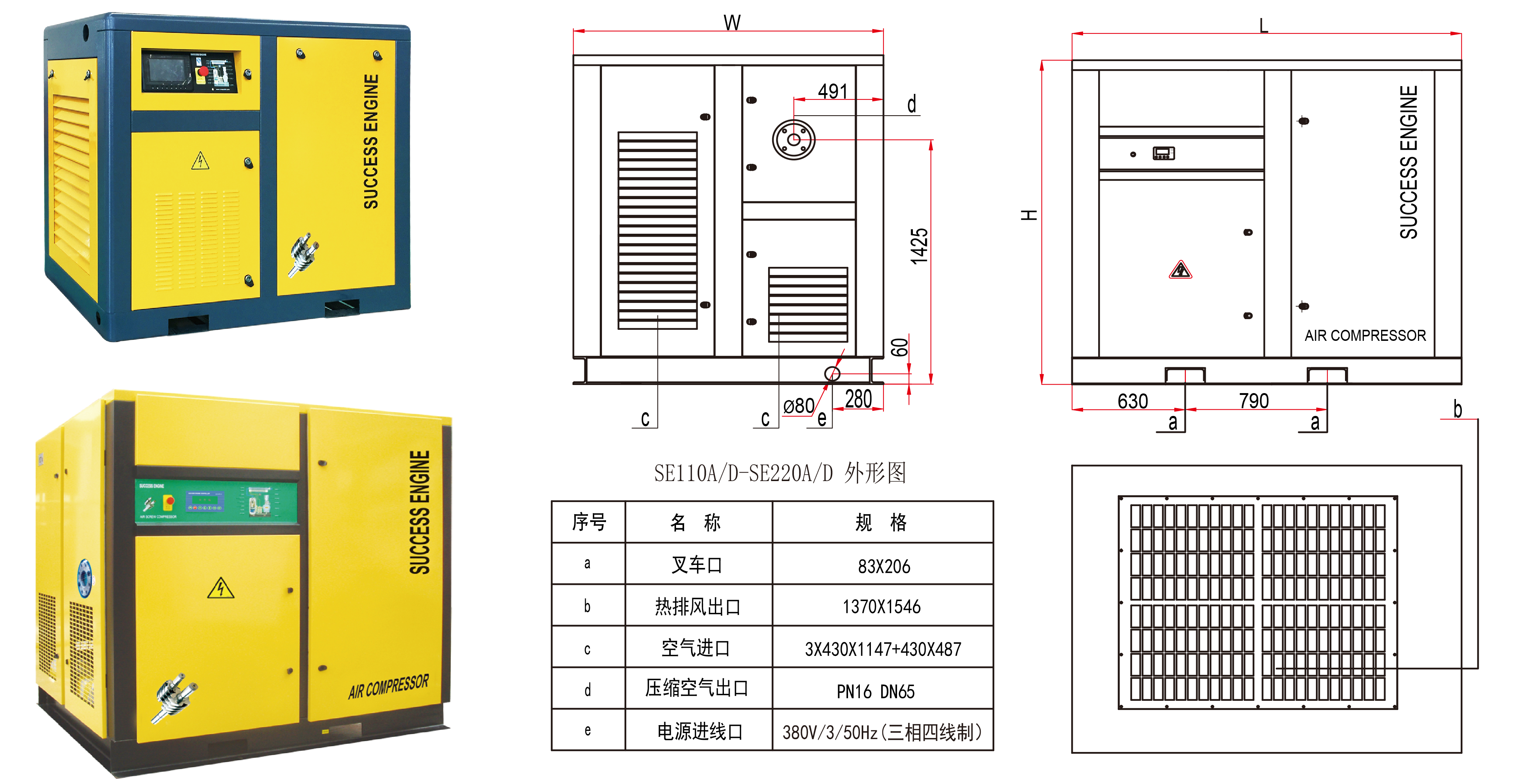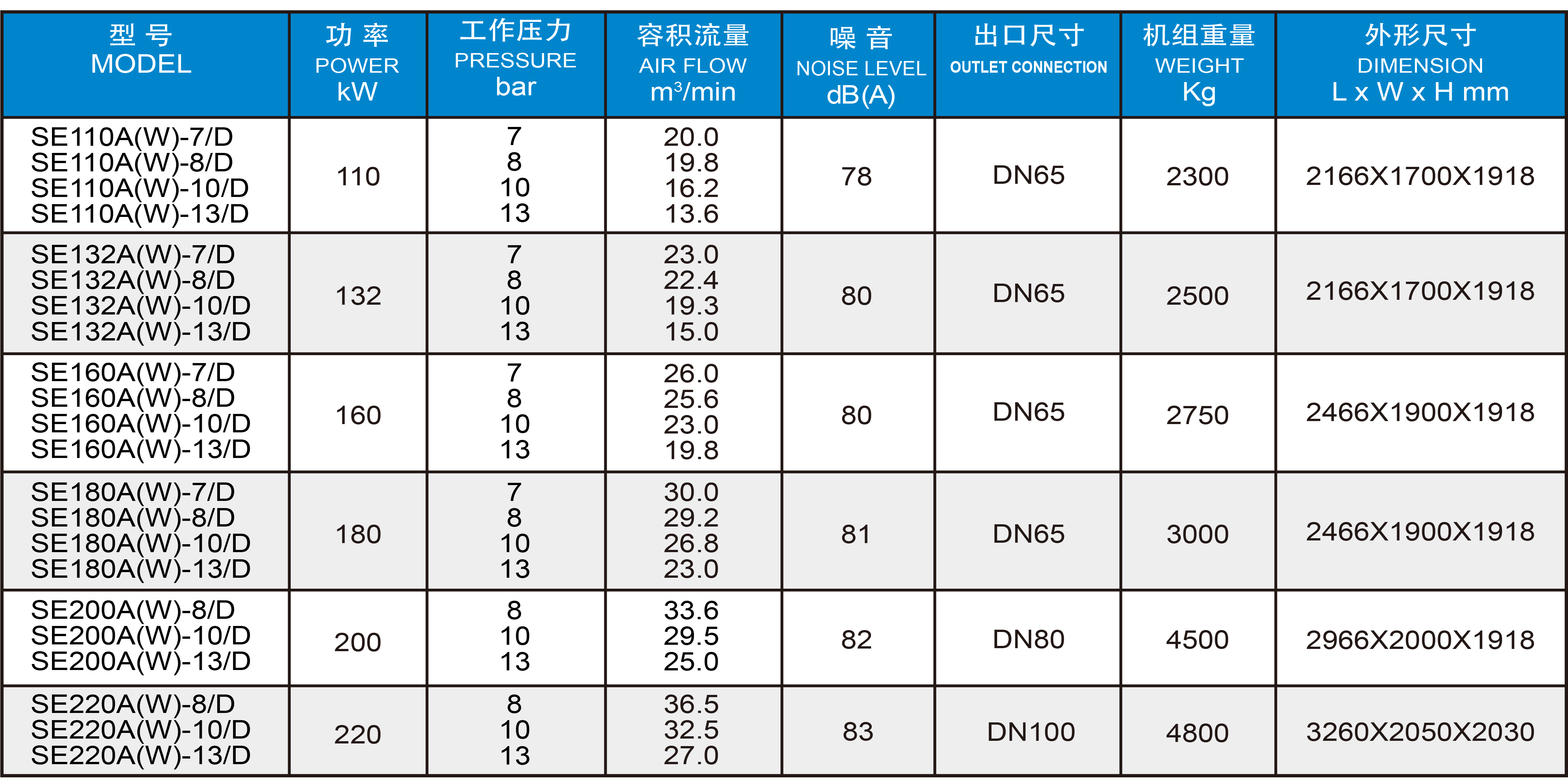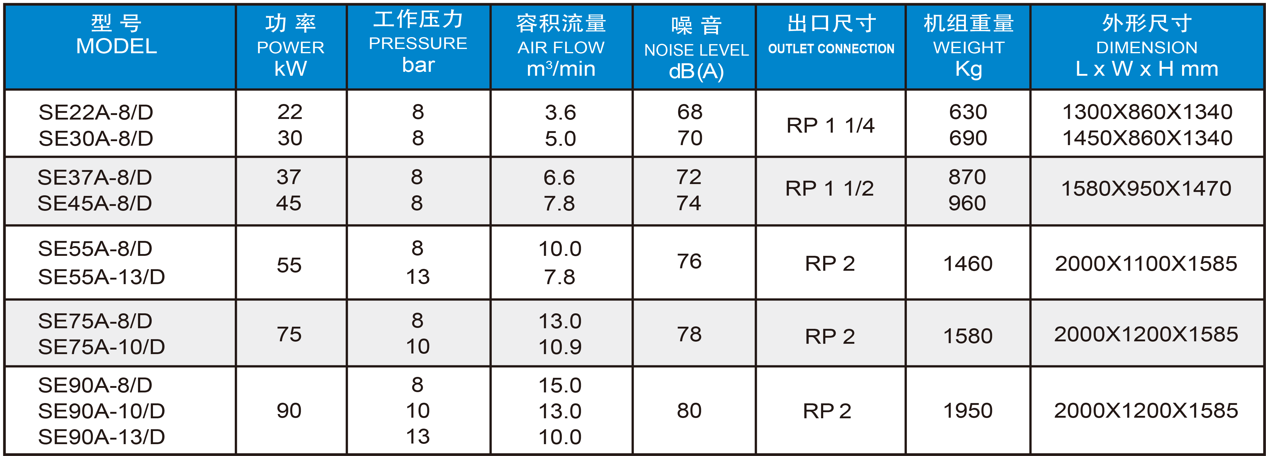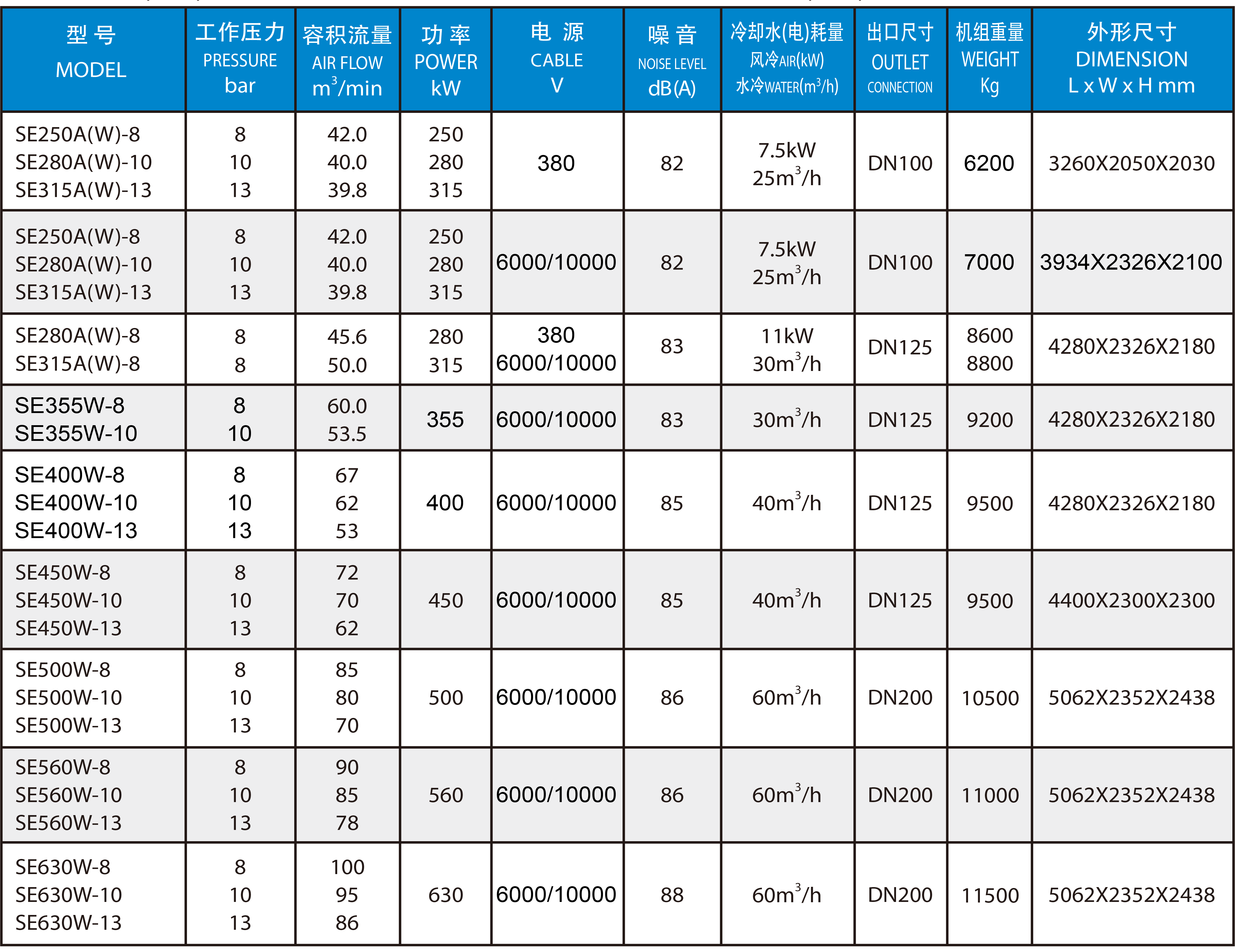 直联传动SE22-630kW(单级压缩)系列 SPECIFICATIONS OF 22-630kW