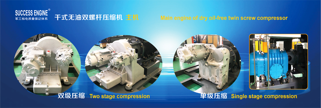 申行健无油螺杆压缩(鼓风)机采用干式单级或双级压缩,通过联轴器带动主机(机头)转动进行空气压缩。压缩腔中除了工作气体,完全没有其他液体的参与,因此,排出的压缩气体洁净无油。